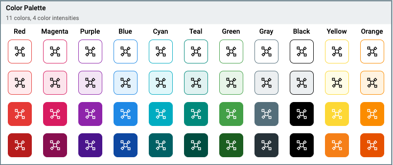A Shape can be assigned one of 11 colors and for each of the colors there are 4 intensity levels. Colors are selected from the Material Design Color palletes and tested for accessibility: