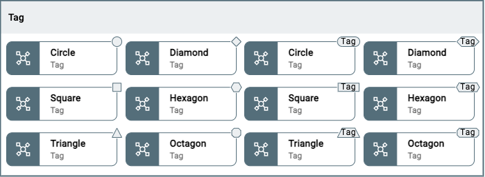 A Tag can be added to the Shape to add additional information. There are 6 differente Tags (Circle, Square, Triangle, Diamond, Hexagon, Octagon), which can be empty or a text can be added e.g. to distinguish Active from Passive elements: